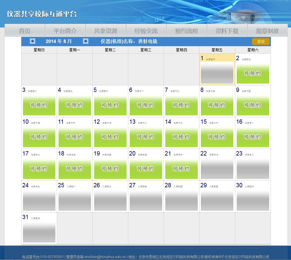 系統(tǒng)中規(guī)定預(yù)約者可以提前多少天預(yù)約設(shè)備,在允許預(yù)約設(shè)備的范圍內(nèi),用戶可以按照小時(shí)進(jìn)行預(yù)約設(shè)備;儀器管理員可以控制設(shè)備的預(yù)約時(shí)間,靈活的實(shí)現(xiàn)設(shè)備先服務(wù)于學(xué)校,再服務(wù)于校外的宗旨。