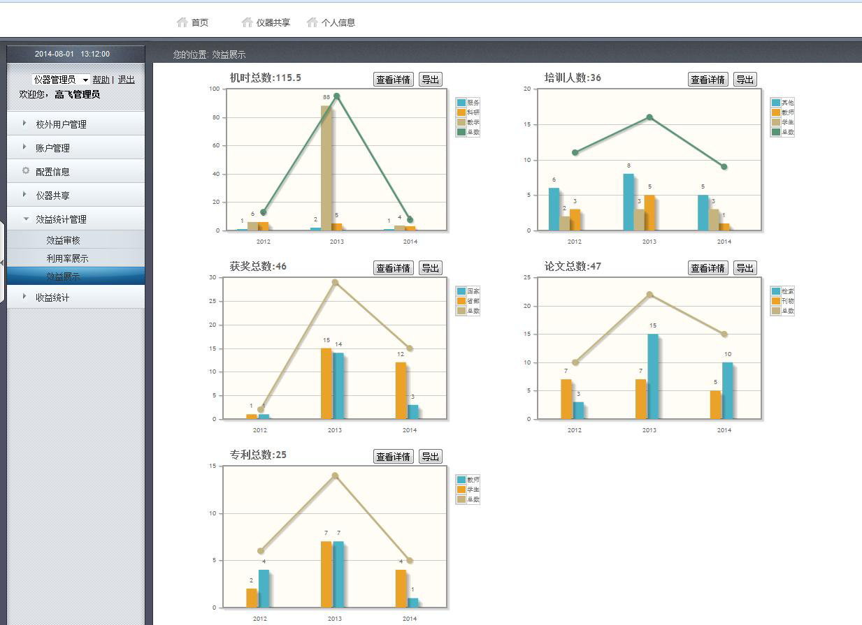 管理人員可以在此某塊中對(duì)用戶提交的效果數(shù)據(jù)進(jìn)行審核。管理人員也可以根據(jù)根據(jù)查詢類型、時(shí)間范圍、效益類型來查看所有儀器的使用后產(chǎn)生的效果,用戶效果會(huì)通過圖形的形式形象的展示給管理人員,同時(shí)為了管理員能夠充分的掌握儀器的使用情況,在此模塊中增加了儀器的利用的功能,可以將儀器每年使用過和未使用過的儀器通過柱形圖明朗的展示出來。