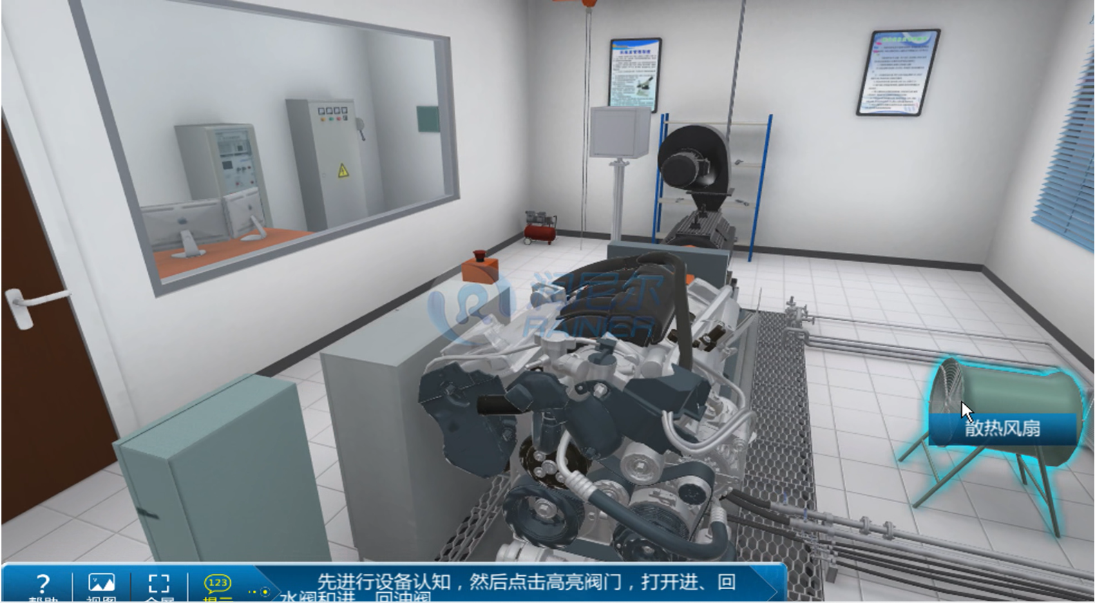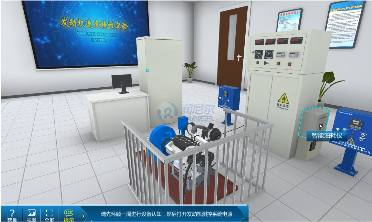 本實(shí)驗(yàn)可在虛擬三維實(shí)驗(yàn)室進(jìn)行漫游,進(jìn)行全方位的設(shè)備認(rèn)知。通過(guò)系統(tǒng)引導(dǎo)依次打開進(jìn)回水閥、回油閥、打開溫控裝置水路、打開強(qiáng)電弱電打開電腦啟動(dòng)耗油儀的供油泵和發(fā)動(dòng)機(jī)泵,在電腦上查看實(shí)驗(yàn)結(jié)果、關(guān)閉設(shè)備及強(qiáng)弱電等操作。