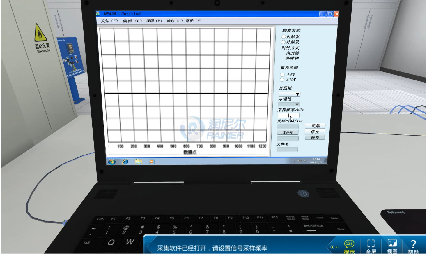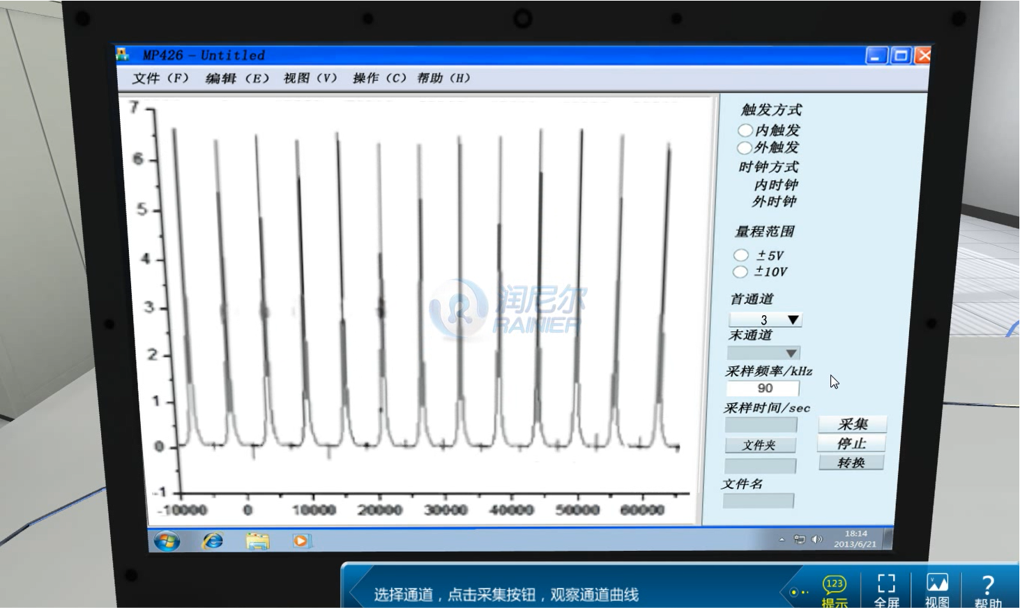 本實(shí)驗(yàn)可在虛擬三維實(shí)驗(yàn)室進(jìn)行漫游,進(jìn)行全方位的設(shè)備認(rèn)知。通過(guò)系統(tǒng)引導(dǎo)組裝測(cè)試設(shè)備,依次打開FC2000發(fā)動(dòng)機(jī)測(cè)控系統(tǒng)電源、打開電腦、啟動(dòng)測(cè)試軟件、設(shè)置采樣頻率、工控機(jī)電源、啟動(dòng)發(fā)動(dòng)機(jī)等到發(fā)動(dòng)機(jī)啟動(dòng)到額定轉(zhuǎn)速后,點(diǎn)擊軟件中的首通道選擇不同的通道查看對(duì)應(yīng)的實(shí)驗(yàn)曲線。