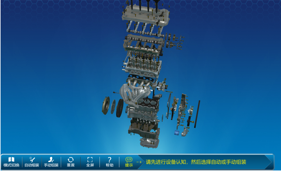 本實(shí)驗(yàn)可以360度觀看汽油發(fā)動(dòng)機(jī)三維模型,并可以查看曲柄連桿機(jī)構(gòu),水泵,機(jī)油泵等十幾個(gè)工作原理動(dòng)畫。在發(fā)動(dòng)機(jī)拆解與組裝裝模塊有自動(dòng)和手動(dòng)兩種形式