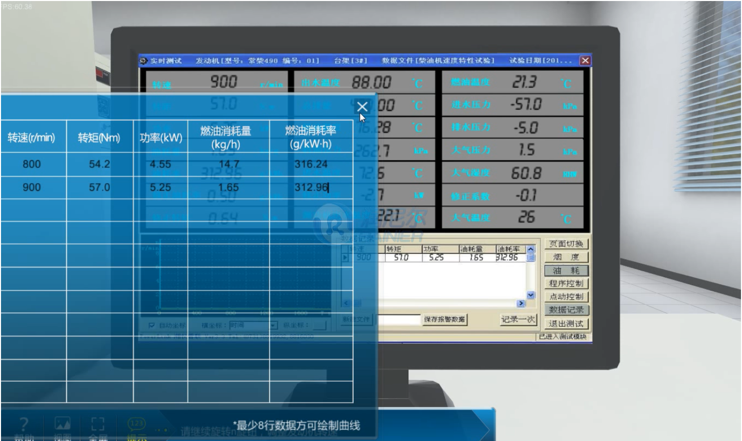 本實(shí)驗(yàn)可在虛擬三維實(shí)驗(yàn)室進(jìn)行漫游,進(jìn)行全方位的設(shè)備認(rèn)知。通過(guò)系統(tǒng)引導(dǎo)依次打開FC2000發(fā)動(dòng)機(jī)測(cè)控系統(tǒng)電源 、工控機(jī)電源、打開電腦、啟動(dòng)測(cè)試軟件、啟動(dòng)發(fā)動(dòng)機(jī)等到發(fā)動(dòng)機(jī)啟動(dòng)到額定轉(zhuǎn)速后,通過(guò)按發(fā)動(dòng)測(cè)控系統(tǒng)操作面板上的p1/p,m/n,旋轉(zhuǎn)p,M/P1按鈕來(lái)觀察并記錄不同扭矩下轉(zhuǎn)矩、功率、油耗量、油耗率、修正油耗率、修正轉(zhuǎn)矩等參數(shù)。至少記錄8組數(shù)據(jù)就可以繪制轉(zhuǎn)矩與消耗量,轉(zhuǎn)矩與消耗率關(guān)系曲線。