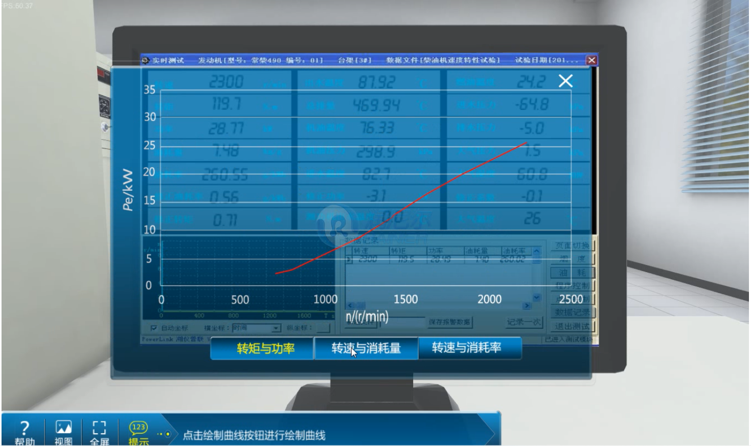本實(shí)驗(yàn)可在虛擬三維實(shí)驗(yàn)室進(jìn)行漫游,進(jìn)行全方位的設(shè)備認(rèn)知。通過(guò)系統(tǒng)引導(dǎo)依次打開FC2000發(fā)動(dòng)機(jī)測(cè)控系統(tǒng)電源 、工控機(jī)電源、打開電腦、啟動(dòng)測(cè)試軟件、啟動(dòng)發(fā)動(dòng)機(jī)等到發(fā)動(dòng)機(jī)啟動(dòng)到額定轉(zhuǎn)速后,通過(guò)按發(fā)動(dòng)機(jī)測(cè)控系統(tǒng)操作面板上的p1/p,n/p,旋轉(zhuǎn)p,n按鈕來(lái)觀察并記錄不同轉(zhuǎn)速下轉(zhuǎn)矩、功率、油耗量、油耗率、修正油耗率、修正轉(zhuǎn)矩等參數(shù)。至少記錄8組數(shù)據(jù)就可以繪制轉(zhuǎn)矩與功率,轉(zhuǎn)速與消耗,轉(zhuǎn)速與消耗率關(guān)系曲線。
