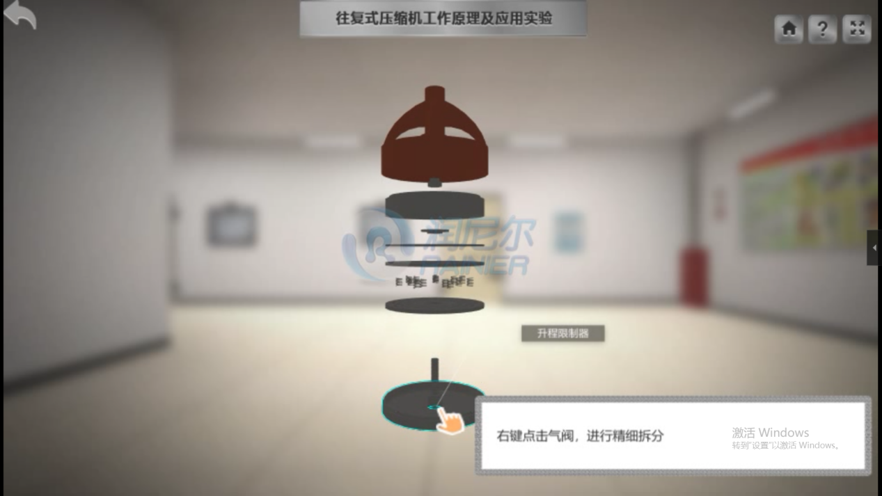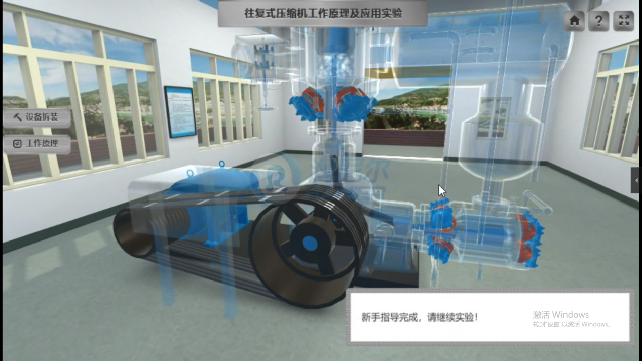本實(shí)驗(yàn)的實(shí)驗(yàn)?zāi)康氖鞘箤?shí)驗(yàn)者通過(guò)認(rèn)識(shí)往復(fù)式壓縮機(jī)的內(nèi)部結(jié)構(gòu),熟惡并學(xué)會(huì)壓縮機(jī)的拆裝,并觀察壓縮機(jī)內(nèi)氣體的壓縮過(guò)程,掌握往復(fù)式壓縮機(jī)的工作原理。實(shí)驗(yàn)開(kāi)始前有新手引導(dǎo),實(shí)驗(yàn)者可通過(guò)鼠標(biāo)和鍵盤(pán)在實(shí)驗(yàn)室中漫游,觀察設(shè)備,調(diào)節(jié)視角。