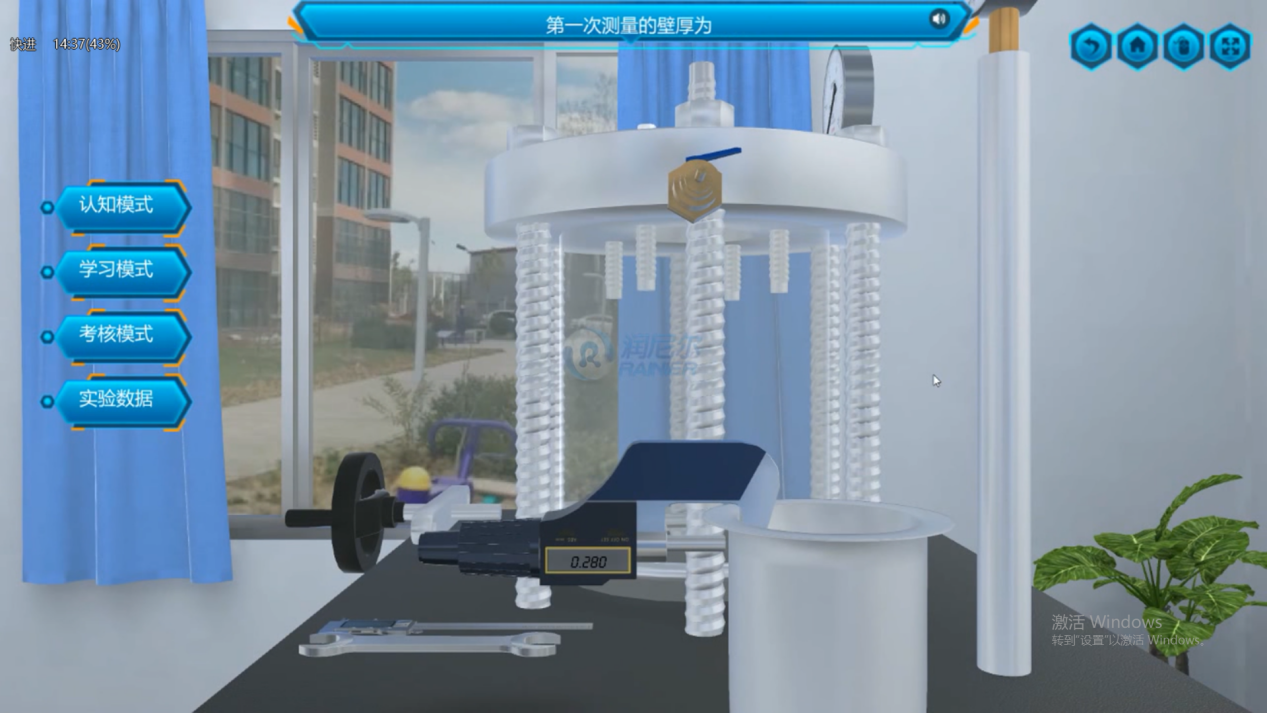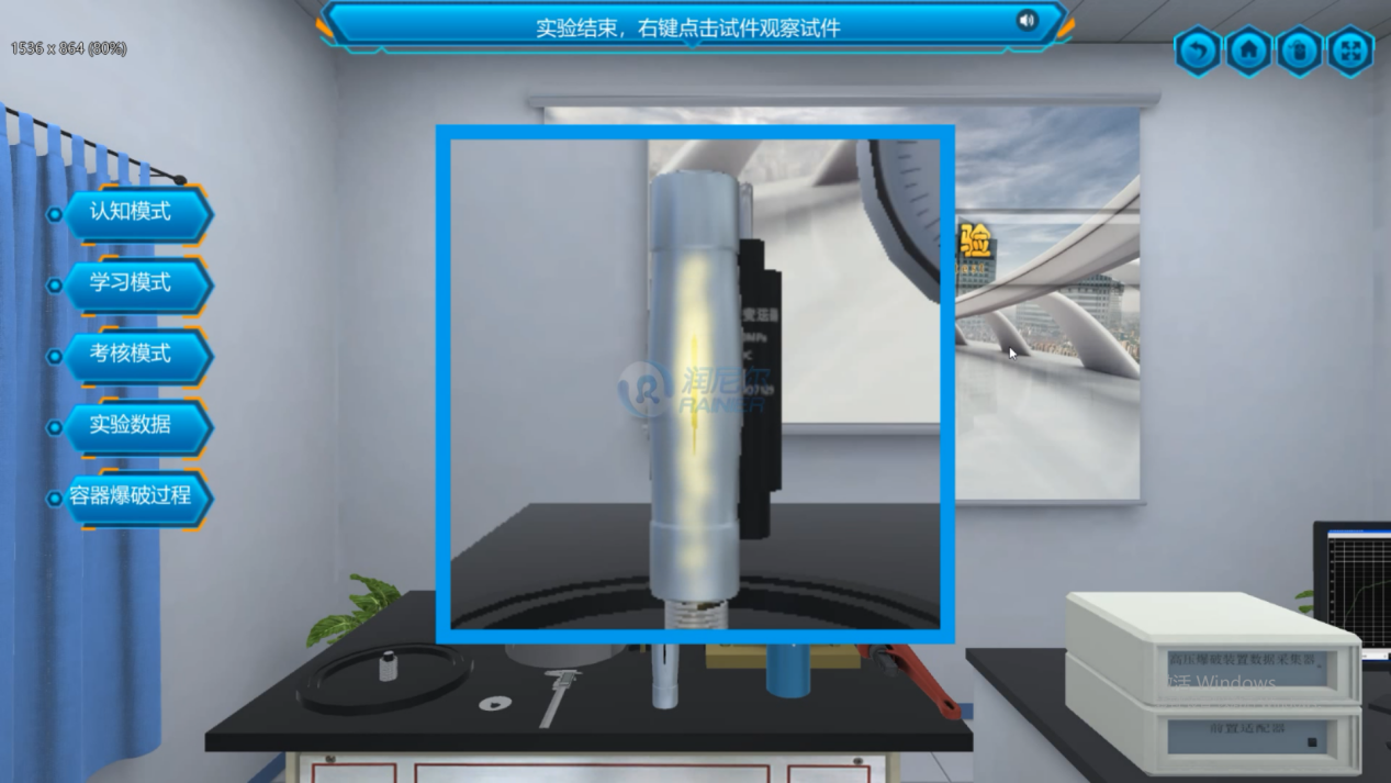 驗(yàn)操作分為學(xué)習(xí)模式和考核模式,實(shí)驗(yàn)者可以在兩種設(shè)備間選擇一個(gè)進(jìn)行實(shí)驗(yàn),系統(tǒng)會(huì)以高亮提示實(shí)驗(yàn)者應(yīng)該進(jìn)行操作的結(jié)構(gòu),并在屏幕上方給出提示文字,實(shí)驗(yàn)者跟隨引導(dǎo)點(diǎn)擊高亮區(qū)域,逐步進(jìn)行操作,采用游標(biāo)卡尺等測(cè)量工具進(jìn)行了三次測(cè)量,學(xué)生可點(diǎn)擊左側(cè)實(shí)驗(yàn)數(shù)據(jù)按鈕查看實(shí)驗(yàn)中采集的數(shù)據(jù)進(jìn)行查看,并在電腦上查看實(shí)驗(yàn)結(jié)果,最后點(diǎn)擊左側(cè)容器爆破過(guò)程按鈕查看容器爆破。