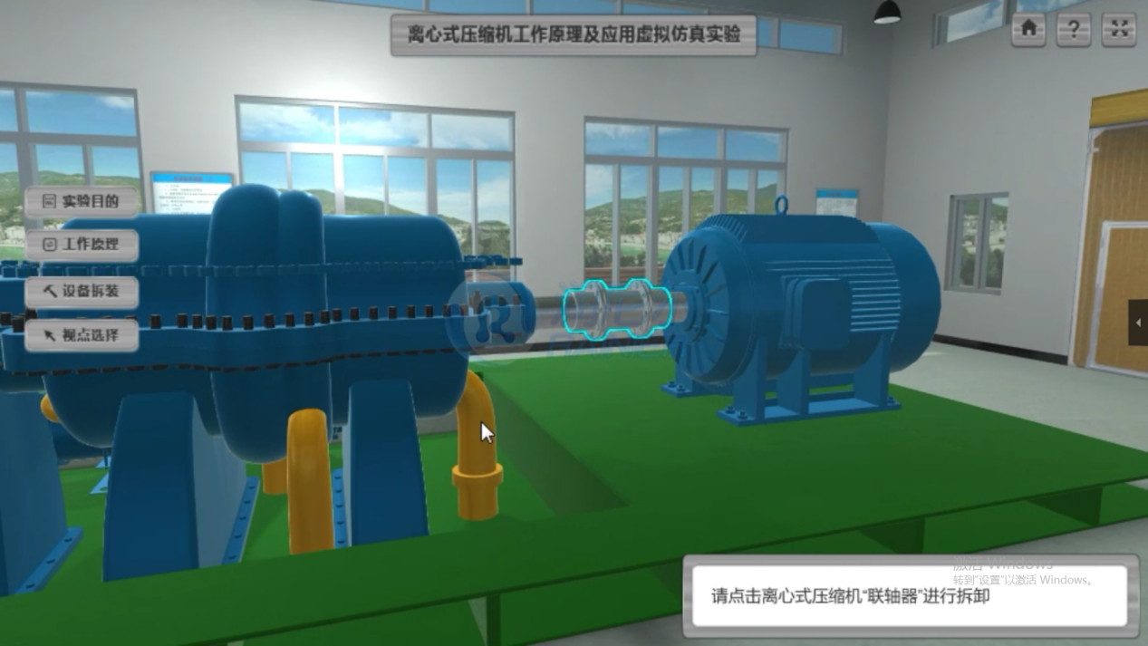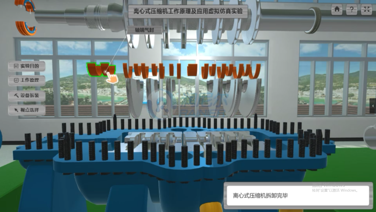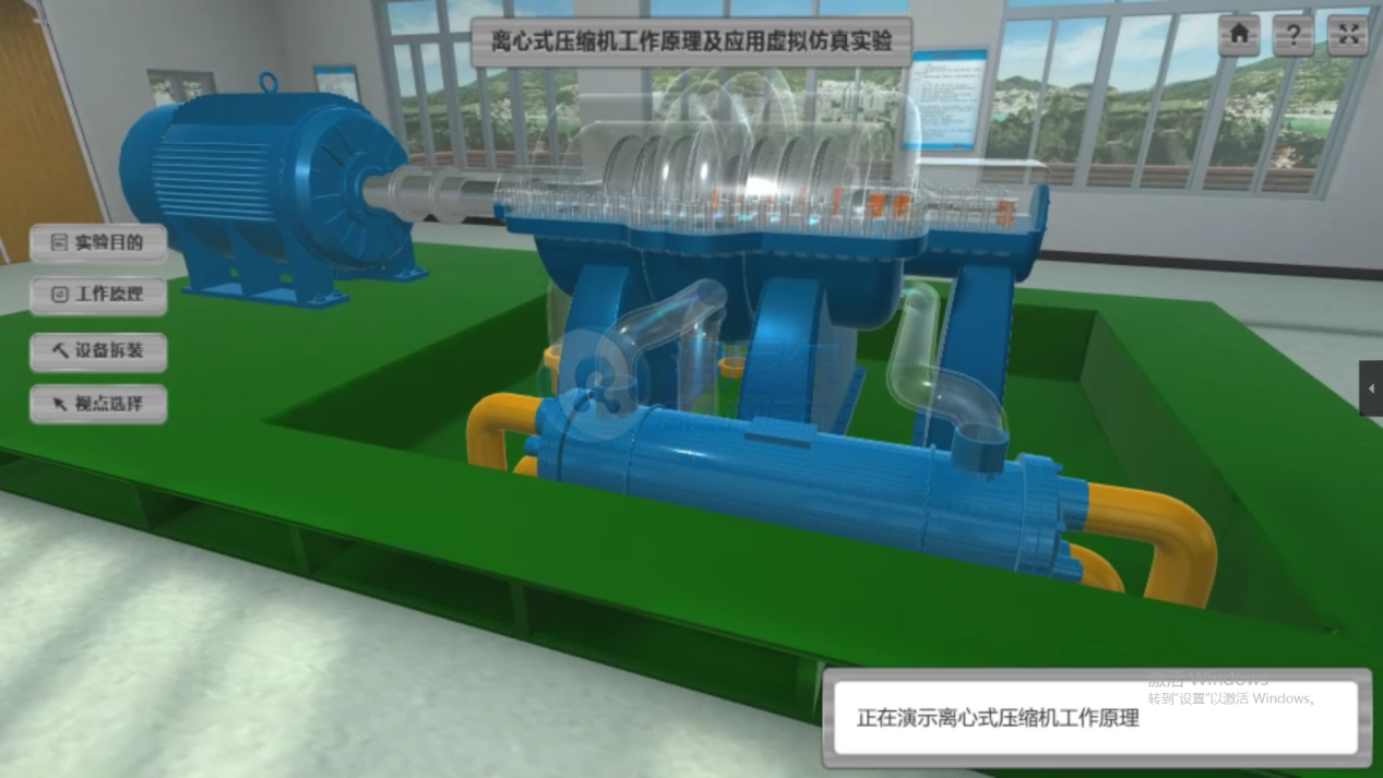 本實(shí)驗(yàn)的實(shí)驗(yàn)?zāi)康氖鞘箤?shí)驗(yàn)者通過(guò)認(rèn)識(shí)離心式壓縮機(jī)的內(nèi)部結(jié)構(gòu),熟惡并學(xué)會(huì)壓縮機(jī)的拆裝,并觀察壓縮機(jī)內(nèi)氣體的壓縮過(guò)程,掌握離心式壓縮機(jī)的工作原理和離心式壓縮機(jī)的喘振機(jī)理。實(shí)驗(yàn)開(kāi)始前有新手引導(dǎo),實(shí)驗(yàn)者可通過(guò)鼠標(biāo)和鍵盤(pán)在實(shí)驗(yàn)室中漫游,觀察設(shè)備,調(diào)節(jié)視角。