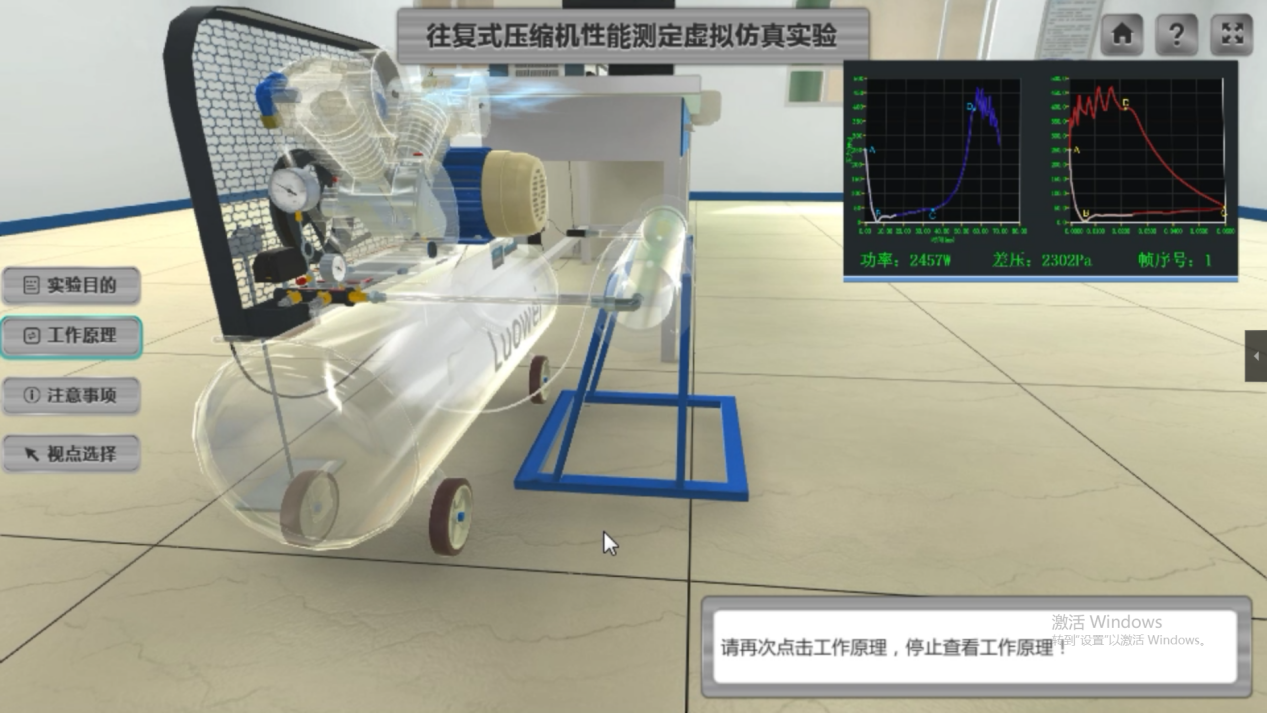 實(shí)驗(yàn)者根據(jù)引導(dǎo)站到指定位置后,界面左側(cè)的工作原理按鈕高亮提示,點(diǎn)擊工作原理按鈕,壓縮機(jī)以動(dòng)畫(huà)形式演示其工作原理,并將設(shè)備表殼透明化,使實(shí)驗(yàn)者能世界看到設(shè)備內(nèi)部結(jié)構(gòu),并使空氣變得具象化,使實(shí)驗(yàn)者能夠理解壓縮機(jī)抽象的工作原理。設(shè)備演示原理期間,實(shí)驗(yàn)者可以360度觀察設(shè)備,并對(duì)設(shè)備細(xì)節(jié)放大進(jìn)行學(xué)習(xí)。工作原理演示完畢后。