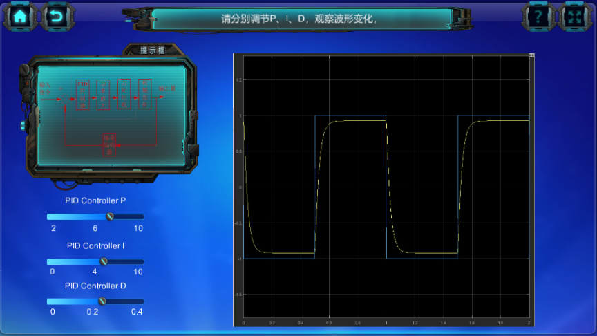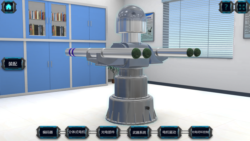 本虛擬實驗為用戶展示了整個反彈坦克武器裝備機電系統(tǒng)的零部件組成,大到模塊分解,小到每個模塊中每一個螺絲的拆裝。除了編碼器、分體式電機、光電部件、武器系統(tǒng)的具體拆解流程,還包括電機驅(qū)動的驅(qū)動組成和驅(qū)動原理中電路的連接,以及光電閉環(huán)控制中P、I、D對波形的變化。