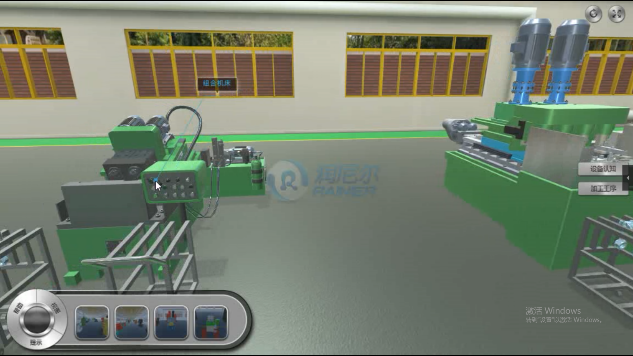 進入實驗后,點擊右側設備認知按鈕,實驗者可以在場景中漫游認識設備,生產(chǎn)線中包含大量設備,使用鼠標懸浮,設備上方會出現(xiàn)相應的名稱標簽,包括立式連桿拉床、組合鏜床、半自動雙頭立軸圓臺平面磨床、連桿組合機、連桿擰緊機、金剛鏜床等、連桿螺絲擰松機、圓工作臺銑床、鏜床等,所有設備均采用三維建模技術智能制造系統(tǒng)按照實際的尺寸建模重構。
