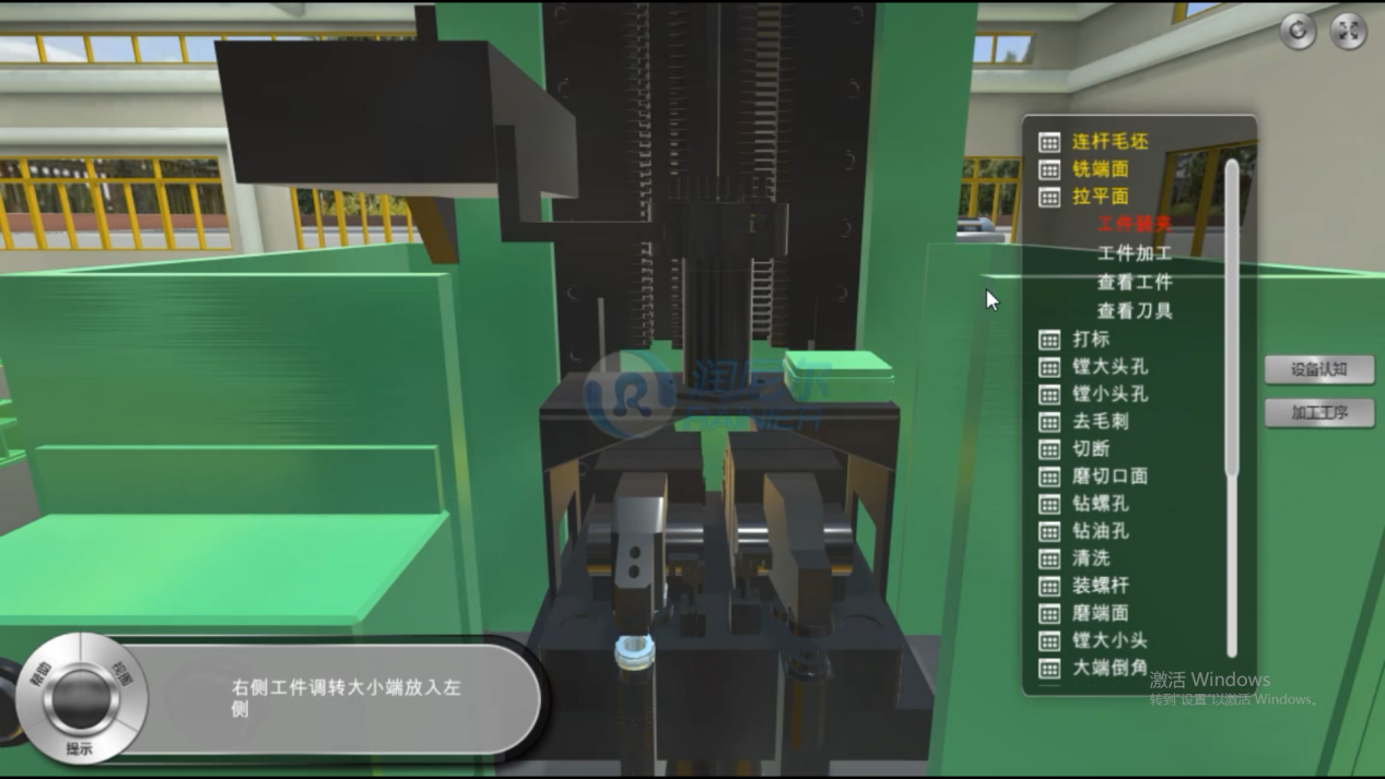 點擊右側的加工工序按鈕,右側屏幕會給出連桿加工的工序,實驗者依次點擊右側工序,生產(chǎn)線按照工序開始進行加工,并在左下角給出操作說明,實驗者需要經(jīng)過全部工序,才能加工完成;在查看環(huán)節(jié),實驗者可以將工件和刀具放在屏幕中央進行翻轉(zhuǎn)進行360度觀察。