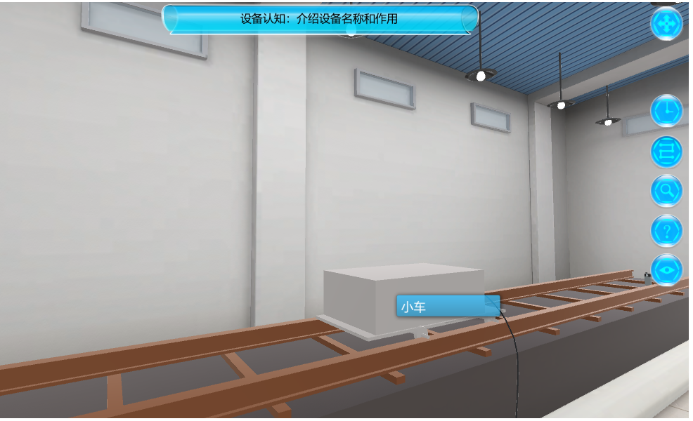 本實驗展示了實驗者通過連接電線線路使小車在軌道上運行的過程,規(guī)避了學生進行電路實驗的危險性。點擊右側設備認知按鈕,實驗者可在場景中漫游,查看實驗器材,鼠標懸浮于設備上,會出現(xiàn)相應的設備名標簽,實驗包括配電箱、軌道、小車等裝備。
