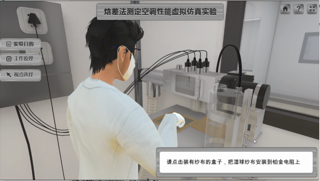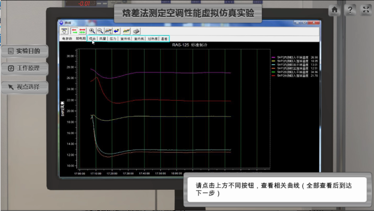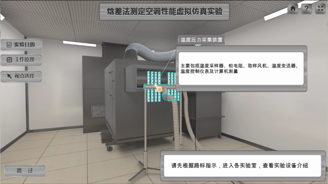 點擊界面左側的工作原理可查看空調(diào)器焓差法測試涉及的全部裝置原理圖,對實驗原理進行梳理;實驗者還可以根據(jù)界面左側的視點選擇快捷到達目的實驗室。