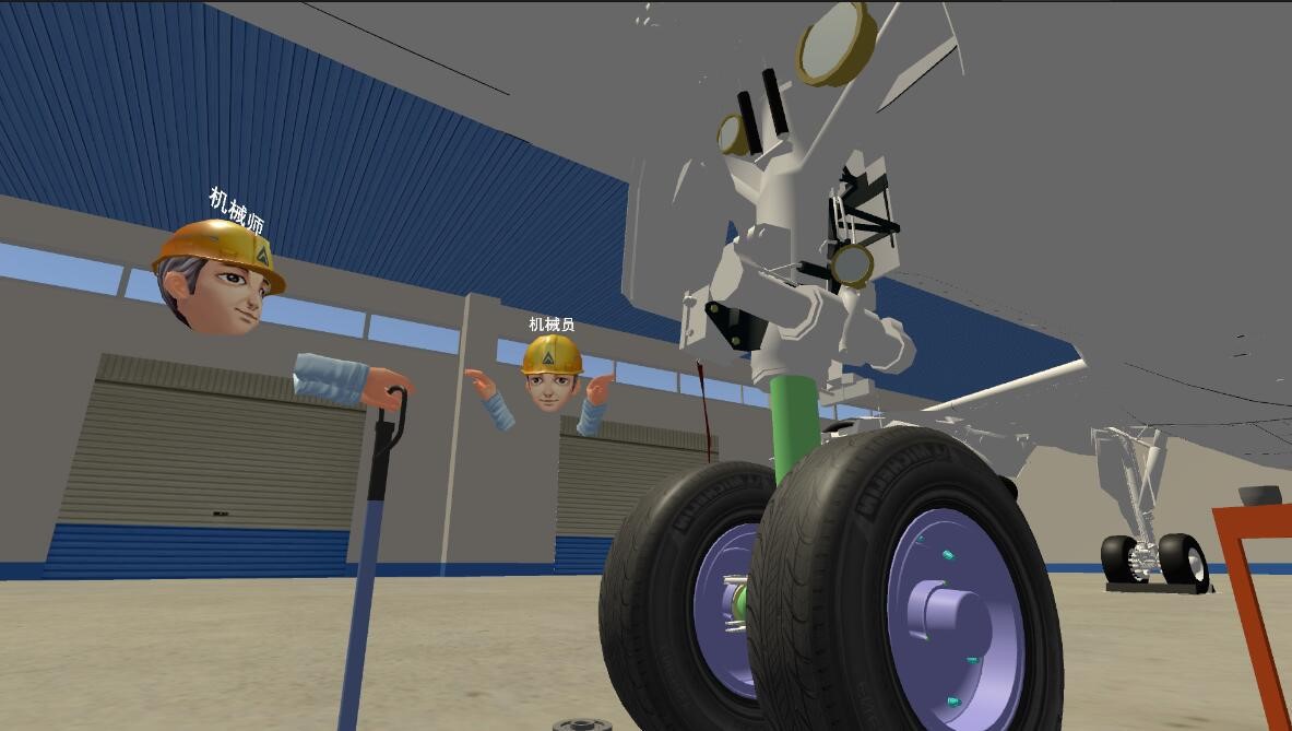 系統(tǒng)采用多人聯(lián)機交互技術,按照機輪拆裝訓練手冊,有學員扮演機械師,有學員扮演機械員,他們分工配合,共同完成對飛機機輪系統(tǒng)的VR拆裝。同時,系統(tǒng)具備對拆裝步驟、質(zhì)量等方面的評估打分,教員可在線監(jiān)控學員的操作,進行故障預設、競賽等功能。