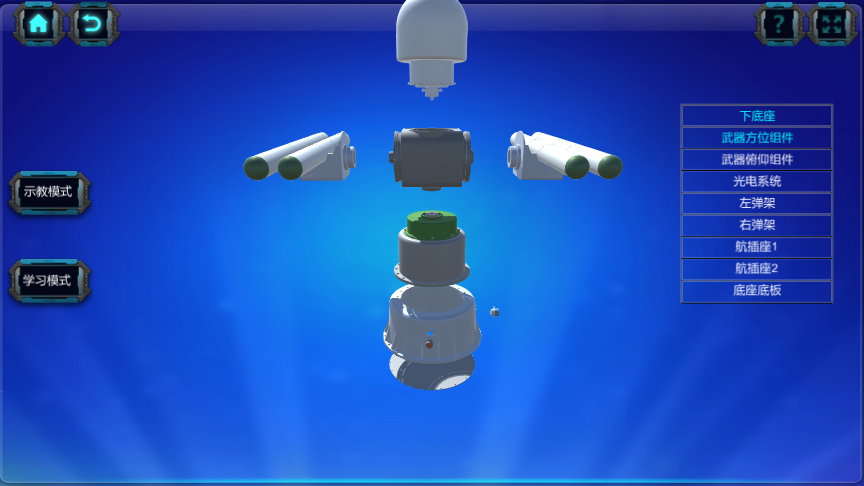 然后點擊子模塊進行裝配學習,實驗分為“示教模式”和“學習模式”,學生可循序漸進學習組成部件安裝規(guī)則,依次完成編碼器、分體式點擊、光電部件、武裝系統(tǒng)、電機驅(qū)動、光電閉環(huán)控制進行裝配。