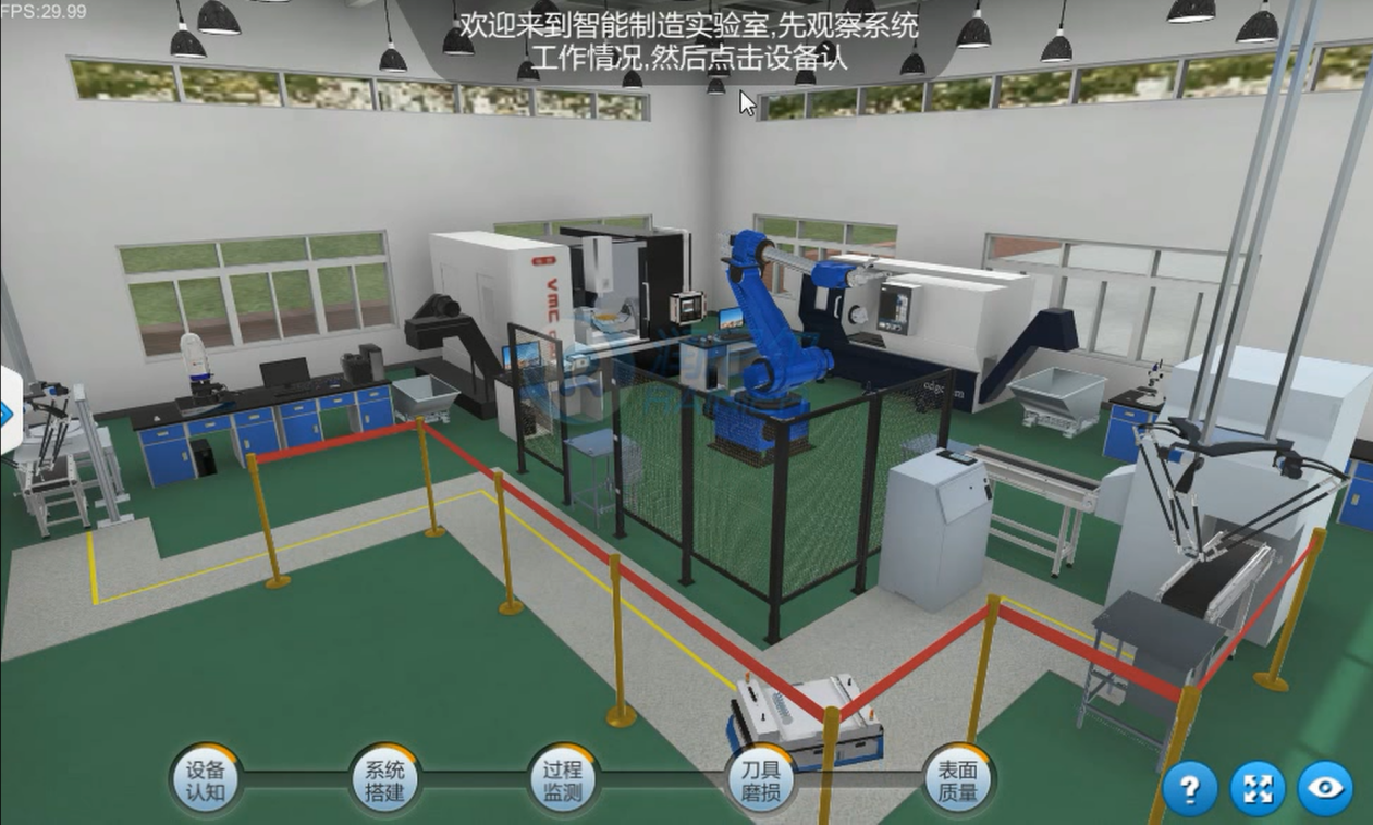 采用三維建模模擬真實的五軸加工中心切削加工及相關參數監(jiān)控實驗場景其中包括AGV小車、機械手、機械臂、數控車床、五軸加工中心等設備。