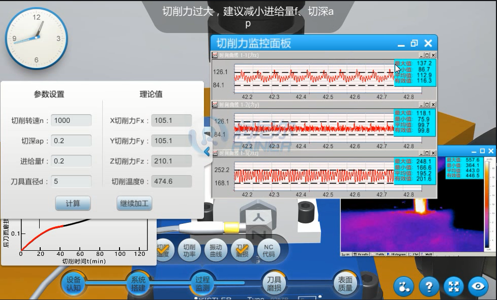 切削加工過程中,系統(tǒng)支持用戶手動輸入刀具轉速、進給量、切深、刀具直徑等加工參數;系統(tǒng)自動判斷輸入參數的合理性,對不合理的參數設置進行醒目的警示提醒;系統(tǒng)支持利用經驗公式對用戶輸入的合理的加工參數進行計算,得到切削力、切削溫度的理論值;系統(tǒng)支持實時監(jiān)控切削加工過程中的各項參數,對超限的參數進行醒目的報警提示;