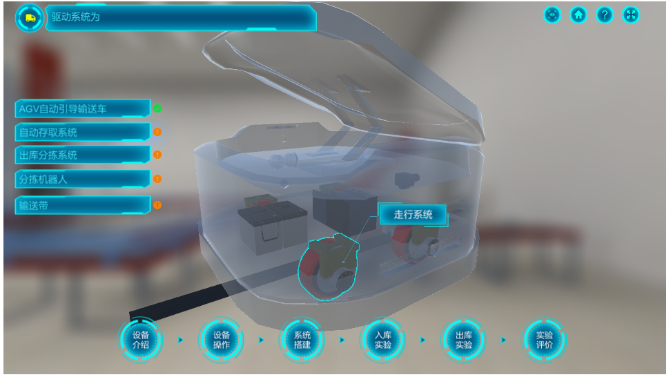 首先,實(shí)驗(yàn)者可點(diǎn)擊設(shè)備介紹和設(shè)備操作,對(duì)AGV操作方法,立體倉(cāng)庫(kù)操作方法,自動(dòng)分揀機(jī),電子便簽揀貨系統(tǒng)等五個(gè)設(shè)備的工作原理和基木操作進(jìn)行學(xué)習(xí)。