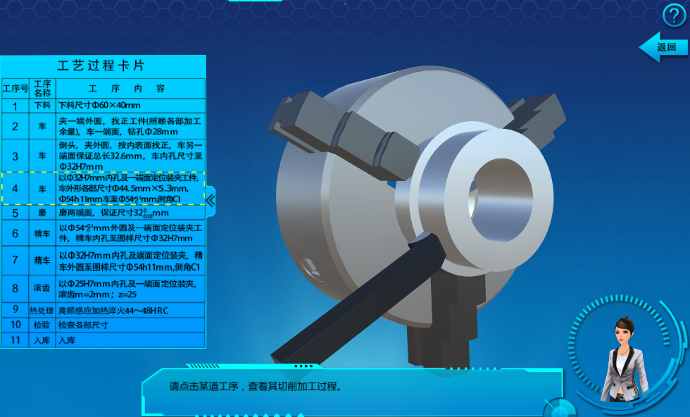 夾具、被加工件與刀具相互配合的形式,以三維動(dòng)畫的形式展現(xiàn)零件從毛坯到加工成最終零件的整個(gè)過程,期間用戶可以360°自由觀察。