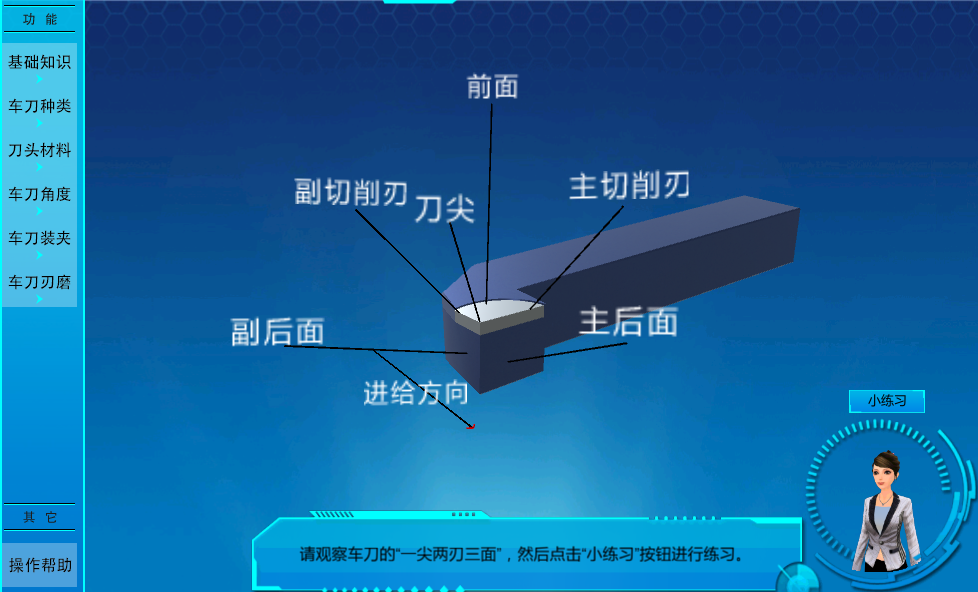 在車刀角度環(huán)節(jié),同樣設(shè)置有小練習(xí),通過小練習(xí)考察和鞏固學(xué)生對(duì)車刀幾何角度的認(rèn)知。