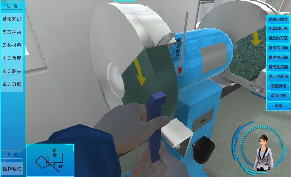 在車刀刃磨環(huán)節(jié),以人物動(dòng)畫的形式示范車刀刃磨的動(dòng)作要領(lǐng)和方法。