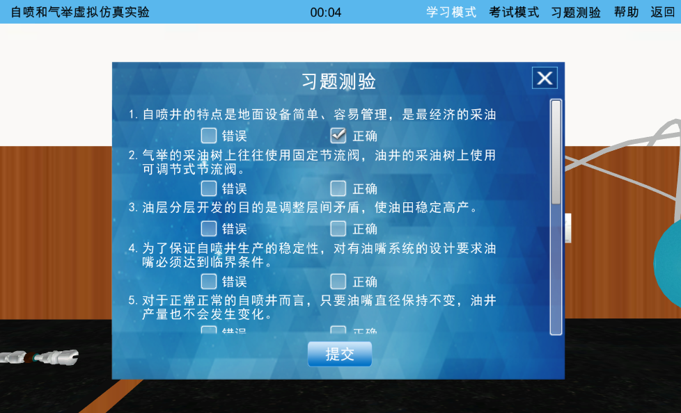 為了以最少的經費投入解決以上問題,并進一步激發(fā)學生的學習興趣、增強實驗效果、提高實驗教學質量,我們開發(fā)了采油工程三維虛擬實驗教學系統(tǒng)。該軟件分為學習模式和考核模式,在考核模式下,可對該虛擬實驗的知識點進行考核。可滿足高等學校和各類培訓機構實驗教學環(huán)節(jié)的需要,尤其適用于遠程教學。