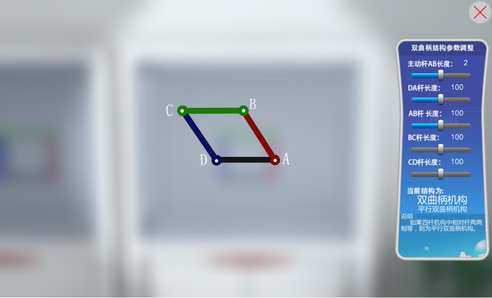 本虛擬實(shí)驗(yàn)提供了所搭接機(jī)構(gòu)的機(jī)構(gòu)運(yùn)動(dòng),通過(guò)演示實(shí)驗(yàn),使學(xué)者了解平面連桿機(jī)構(gòu)的組成形式,鉸鏈四連桿機(jī)構(gòu)中曲柄搖桿機(jī)構(gòu)、雙曲柄機(jī)構(gòu)、雙搖桿機(jī)構(gòu)的組成特點(diǎn)。