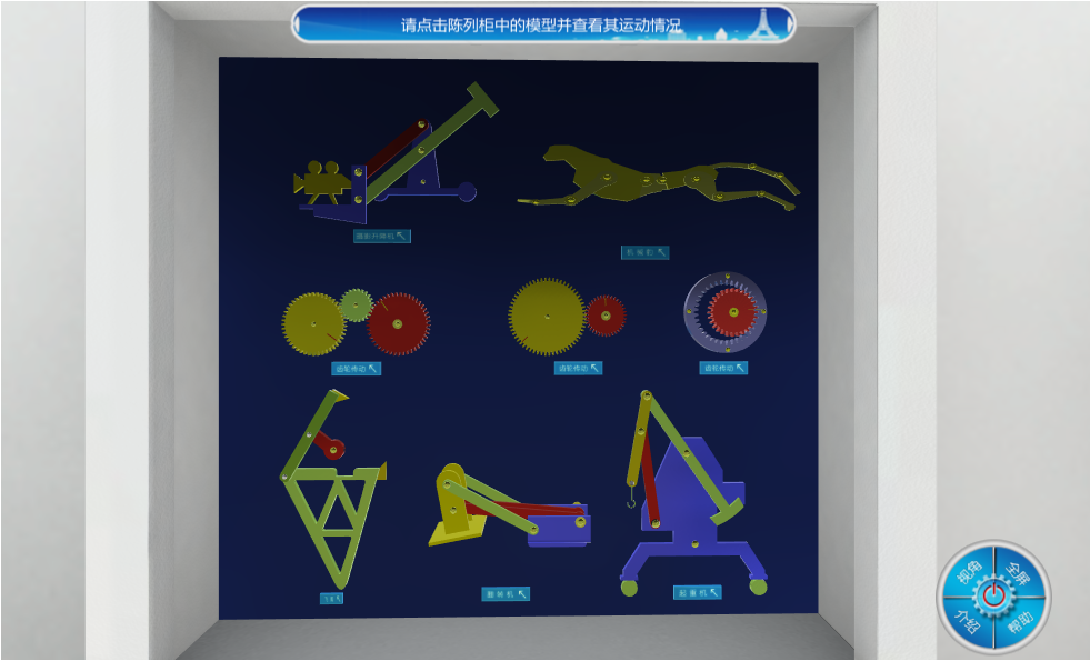 本虛擬實(shí)驗(yàn)提供了近十種類型機(jī)械運(yùn)動(dòng)機(jī)構(gòu)的運(yùn)動(dòng)形式,包括機(jī)器與機(jī)構(gòu)、平面邊桿機(jī)械的基本形式、平面連桿機(jī)構(gòu)、凸輪機(jī)構(gòu)的形成、齒輪機(jī)構(gòu)的各種類型、齒輪的基本性質(zhì)、輪系的基本形成、間歇運(yùn)動(dòng)機(jī)構(gòu)、組合機(jī)構(gòu)和空間連桿機(jī)構(gòu),加強(qiáng)學(xué)者對(duì)機(jī)械與機(jī)器的認(rèn)識(shí),通過(guò)實(shí)驗(yàn),直觀地、全面地了解理論力學(xué)相關(guān)機(jī)構(gòu),了解各種機(jī)構(gòu)的組成及應(yīng)用情況。