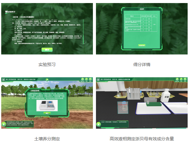 浙江省道地藥材浙貝母的施肥技術(shù)與含量分析的操作技能對藥學(xué)專業(yè)學(xué)生的儀器分析能力培養(yǎng)非常重要,但由于其操作復(fù)雜、實驗成本時間較高和場地條件限制,在實體實驗中難以完成。學(xué)生通過在三維場景中實現(xiàn)從各周期浙貝母植株施肥方案設(shè)計、植株生長數(shù)據(jù)分析、浙貝母收獲、高效液相使用、分析方法設(shè)置、數(shù)據(jù)整理等方面的演練操作,熟悉浙貝母施肥方式方法、高效液相分析的操作過程,根據(jù)實驗操作提示和物體高亮提示,使用各種工具進行實驗操作,最后完成整體的實驗流程;關(guān)鍵計分點在無操作提示條件下進行實驗操作,系統(tǒng)可自動判斷操作是否正確,實驗操作結(jié)束后,針對操作過程設(shè)置考核點可彈出最終操作得分。